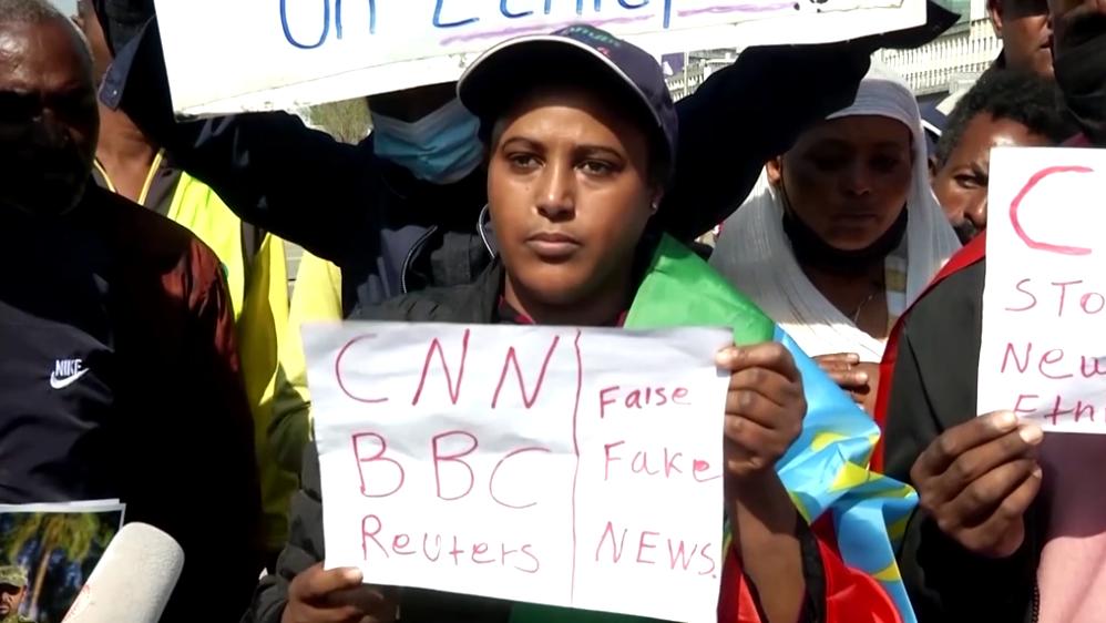 示威者稱,試圖摧毀埃塞的行為永遠不會成功。報道視頻截圖 25日,數十名抗議者又帶著憤怒來到當地美國大使館,高舉寫有“干涉是不民主的”和“真相獲勝”的橫幅。 在被要求置評時,美國大使館一名官員辯解稱,海外美國公民的安全是美國務院的最高優先事項之一,華盛頓持續敦促在埃塞的美國公民乘坐商業航班離開。 路透社同時援引埃塞官方媒體說,英國大使館外也發生了抗議活動。24日,英國也要求其公民立即離開埃塞。 今年6月起,埃塞內戰形勢反轉,特別是11月以來,反政府武裝不斷推進,對外放話可能在“幾個月甚至幾周內”攻占首都亞的斯亞貝巴,埃塞政府已宣佈國家進入緊急狀態。 美國政府此前一直希望雙方“無條件停火”,甚至在月初派駐非洲之角特使傑弗里·費爾特曼(Jeffrey Feltman)趕赴當地斡旋。但隨著戰爭繼續,目前不但費爾特曼已經返回美國,美國、法國等也敦促本國公民立即撤離。 綜合路透社和埃塞官方Fana廣播公司11月24日報道,面對已經兵臨首都的“提格雷人民陣線”(下簡稱提人陣)武裝勢力,埃塞政府總理阿比·艾哈邁德已經前往一線戰鬥,另有兩名奧運獎牌得主宣佈將入伍。 另有消息稱,包括美國和英國在內,幾名西方國家的外交官已在上周與“提人陣”特使交流,提出希望“提人陣”勝利的同時,也表達了支持建立新政府的意願。
