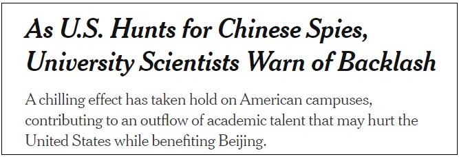 紐約時報報道截圖 根據亞利桑那大學與由著名美籍華裔建築師貝聿銘建立的華裔組織“百人會”近期聯合進行的一項調查,有約半數接受調查的在美華人科學家表示,他們認為美國政府正在監視自己。這些科學家中有一部分是美國公民。 1997年諾貝爾物理獎獲得者、斯坦福大學教授、奧巴馬政府時期擔任過美國能源部長的朱棣文也在公開信上簽了名。他說:“我們的‘智力技術力量’中有相當一部分都來自於移民……我們正朝著自己的腦袋而不是腳部開槍。” 《紐約時報》指出,在特朗普當政期間,美國政府展開了一項名為“中國行動計劃”(China Initiative)的計劃,其雖然披著“防止商業機密盜竊和其他間諜行為”的外衣,但諸多美國學者、科學家、民權組織和議員都質疑其“過度針對學術人員”。 田納西大學諾克斯維爾分校的加拿大籍華人副教授胡安明是所謂“中國行動計劃”的第一個受害者。美國聯邦調查局(FBI)先是懷疑胡安明存在“間諜行為”,接著在對他進行了長達21個月的跟蹤監視卻未能獲得任何證據的情況下依然在2020年2月27日逮捕了胡安明,隨後又指控他“故意隱瞞與中國大學的關係、欺騙了NASA、欺騙了美國政府”等六項罪名。美國聯邦法院直到2021年9月9日才宣判以上指控均不成立,將胡安明無罪釋放。 “那是我一生中最黑暗的日子。”胡安明在獲釋之後首次結束專訪時表示。“我的基本人權遭到侵犯,名譽遭到詆毀,心靈遭受創傷,我的家人也受到了傷害,這不公平。”