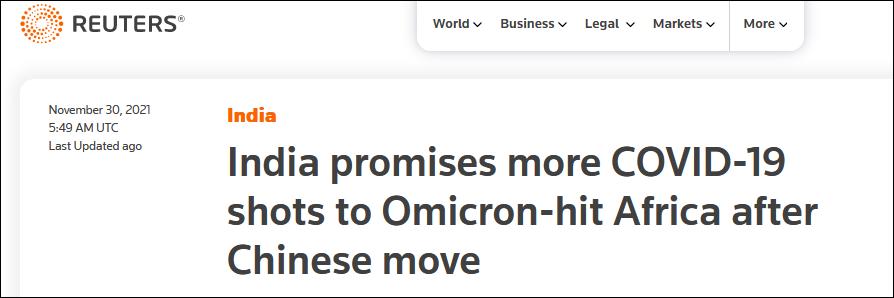 在中國宣佈再向非洲提供10億劑疫苗後,印度“迅速”跟上腳步。據路透社30日報道,印度政府29日晚間表示,印方隨時準備支援非洲國家抗擊奧密克戎變異株,包括提供印度製造的新冠疫苗。