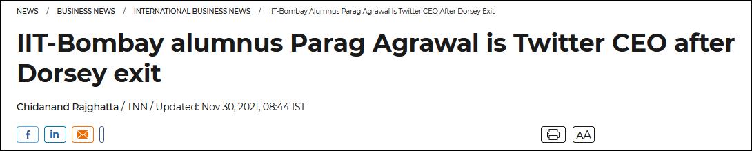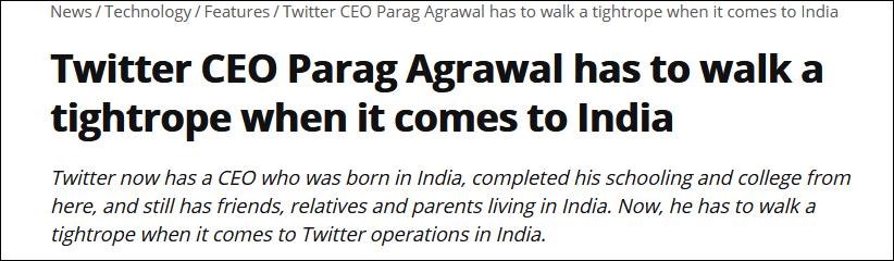 Mint、《今日印度》、《印度時報》等媒體用了大量篇幅關註阿格拉瓦爾接任CEO的消息 印度最大的英文日報《印度時報》在頭條寫道,“阿格拉瓦爾被任命為CEO,印度拿下了推特的控制權”;印度第二大經濟日報《Mint》寫道,“多西退出推特,阿格拉瓦爾接手”;印度另一家主要英文報刊《印度斯坦時報》在報道開頭附上了阿格拉瓦爾致員工的公開信,並在標題中醒目地寫下,“舉世矚目:這是阿格拉瓦爾成為推特CEO後發出的第一條訊息”;新聞網站《今日印度》也難掩興奮之情:“印度擁有世界上最龐大的海外僑民,還培養出了大量為全球科技巨頭服務的人才,印度為此感到驕傲。”