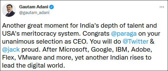 印度第二大富豪、阿達尼集團董事長高塔姆·阿達尼贊揚道,阿格拉瓦爾的成功是“印度人才底蘊和美國精英制度”的證明。他在推特上寫道,“繼微軟、穀歌、IBM、Adobe、Flex、VMware等企業之後,又有一個印度人掘起了,引領著數字世界。”