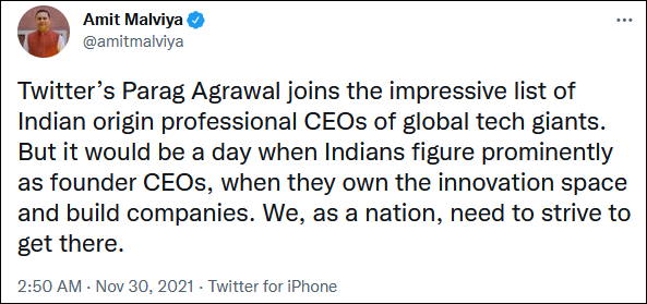 除了這些商業大亨,印度執政黨印人黨全國召集人阿米特·馬爾維亞(Amit Malviya)也加入了慶祝的行列。“阿格拉瓦爾加入了全球科技巨頭印度裔CEO的行列,總有一天,印度人會以創始CEO的身份出現,我們要努力實現這個目標。”