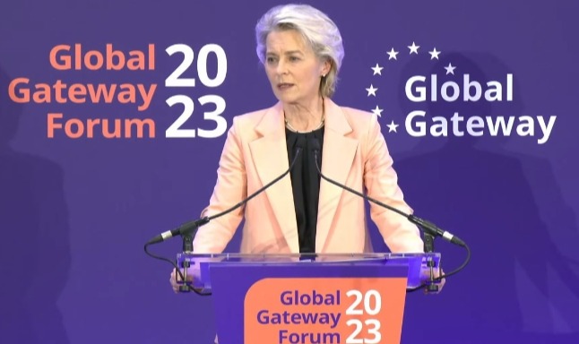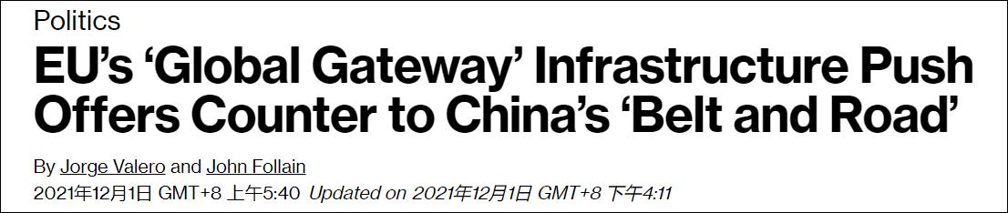 彭博社報道截圖 綜合彭博社、《金融時報》等多家媒體報道,當地時間12月1日,歐盟正式公佈了全球基建計劃——“全球門戶”(Global Gateway)。該計劃將在2021至2027年間,在發展中國家投入3000億歐元(約3400億美元),優先投資數字化、健康、氣候、能源、交通、教育等領域,並協助發展中國家興建光纖電纜、清潔能源輸電線路、運輸通道等基礎設施。 歐盟委員會主席馮德萊恩1日稱:“我們將支持對優質基礎設施的明智投資,尊重最高的社會和環境標準,符合歐盟的民主價值觀和國際規範和標準。‘全球門戶’戰略是歐洲如何與世界建立更具彈性的聯系的模板。” “我們希望使‘全球門戶’成為一個值得信賴的品牌,憑借高質量、可靠的標準、高透明度和良好的治理而脫穎而出。”馮德萊恩稱。
