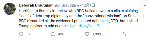 布勞蒂加姆簡介 圖自約翰斯·霍普金斯大學網站 布勞蒂加姆透露,11月30日晚間她接到一通從英國倫敦打來的電話,一名BBC記者想要瞭解她對於所謂中國“債務陷阱外交”(debt trap diplomacy)的看法。她很清楚BBC的來意,英國陸軍情報六局(簡稱“軍情六處”)局長理查德·摩爾(Richard Moore)在接受BBC采訪時曾宣稱,中國人故意利用債務作為杠桿,以獲取戰略資產。 在這通電話里,雙方聊了聊一些背景信息,布勞蒂加姆根據自己和同事對於斯里蘭卡漢班托塔港以及其他案例的廣泛研究,並結合其他研究人員的研究,概述了為什麽中國“債務陷阱外交”的說法站不住腳。同時,她還列舉了在黑山、肯尼亞、贊比亞和其他地方的例子,表示也沒有證據支持一些媒體大肆宣揚的對於中國的“恐懼論調”。 此後,這名BBC記者說,另一名記者會在一個小時後再打電話過來采訪,並錄下音頻。一個小時後,一名女記者打來電話,請布勞蒂加姆就幾個方面作簡單回答,包括:快速解釋一下何為“債務陷阱外交”,敘述有關斯里蘭卡獲其他地方的例證,以及為何證據不支持這些觀點。布勞蒂加姆按要求作出瞭解釋,對方錄下了回答,采訪也就此結束。 然而,讓布勞蒂加姆感到震驚的是,12月1日一早,她接到多位英國同事的消息,這些人長期研究中國海外投資,也非常熟悉布勞蒂加姆的研究內容。他們說,“BBC放出的錄音采訪似乎被剪輯過”,“錄音聽起來像是妳可能支持‘債務陷阱外交’的說法”,“這當然歪曲了妳在其他地方對此問題細致入微的評論”。 因此,布勞蒂加姆親自聽了BBC的采訪音頻,吃驚地發現,該媒體從電話采訪中唯一剪輯出來的部分是其對於“債務陷阱外交”的看法以及關於斯里蘭卡案例的“公眾認知”。 其中,BBC完全扔掉了布勞蒂加姆之後所有關於為何這些“公眾認知”是錯誤的例證,還找來特朗普政府時期的一名顧問,就所謂“中國威脅論”進行了炒作渲染,卻仍未提供關於“債務陷阱外交”的證據。