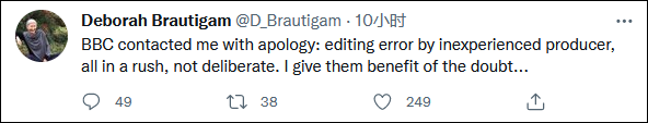 布勞蒂加姆推特截圖 布勞蒂加姆說,她終於意識到,BBC的記者顯然打定了註意,想要輸出其個人的觀點。在音頻的開頭,還出現了一個從未有人問過布勞蒂加姆的問題:“我們能做些什麽來解決這種情況?” “令人沮喪的是,這一切都讓我想起了一種人們的普遍觀念,即中國人正在非洲獲取大量土地種植糧食,然後運回中國。我花了三年時間對這個荒謬的觀點進行實地研究,並寫了一本書(Will Africa Feed China?《非洲餵養中國?》)來揭穿它。” 布勞蒂加姆最後無奈表示,如今似乎沒有人再這麽說了,但並不是因為她,而僅僅是因為有一個更加有趣的“威脅敘事”已經印刻在了媒體的腦海之中,這一切讓人嘆息。 她還透露,自己感到震驚的原因還在於,其本人曾是BBC的超級粉絲,上世紀70年代居住在中國港台地區以及80年代在非洲做實地調查時,經常使用收音機收聽BBC的廣播節目,原本相信它們能夠提供細致而平衡的分析報道。 事後,布勞蒂加姆在個人推特上發文稱,BBC聯系到了她,並向其道歉,還裝模作樣地送上了“臨時工警告”。BBC方面聲稱,剪輯上的差錯是由於製片人缺乏經驗造成的,這一切都是倉促中發生的,並非故意,而布勞蒂加姆則表示,暫且相信他們的“無辜的”……