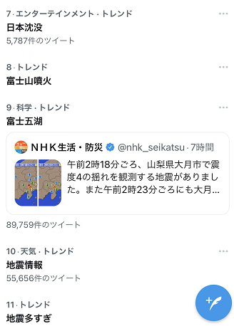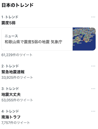 多條與地震災害的關鍵詞霸佔日本推特熱搜 日本時間3日凌晨2時18分、2時23分、6時37分、9時28分,在不同震源處先後發生最高里氏4級、3.6級、4.9級、5.4級地震。日本氣象廳發表緊急地震警報,敦促震感強烈地區在接下來1周期間內提高防範。此外,氣象廳還稱,根據資料,尤其是在地震發生後2至3天期間內,再次發生大規模地震的情況很多。短時間內屢次發生震感強烈地震在日本網絡上引發恐慌,有關地震的多個關鍵詞衝上推特熱搜,不少網民揣測這可能是南海海溝大地震的前兆。
