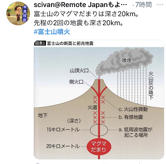“富士山巖漿積攢在底下20千米,之前兩次地震的深度也是20千米”