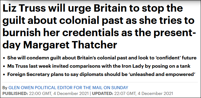 英國政客這下徹底不裝了?英國《每日郵報》5日透露,外交大臣伊麗莎白·特拉斯(Liz Truss)本周將在一場智庫講話中闡述自己的外交政策。她將呼籲英國停止對殖民歷史的愧疚和罪惡感,從而建立一個“自信而積極”的未來。