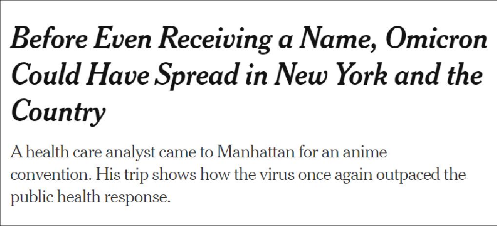 《紐約時報》報道截圖 據《紐約時報》報道,當地時間12月2日,明尼蘇達州報告了美國首例本土傳播的奧密克戎確診病例,這也是美國第二個報告奧密克戎確診病例的州。 該州患者名叫彼得·麥克金,是一名近期剛從紐約市返回到該州的醫療分析師,此前曾參加了於11月18日至20日在賈維茨展覽中心舉行的2021年紐約國際動漫展——活動主辦方估計約有5.3萬人參加了這場展會。 報道指出,麥克金在參加完國際動漫展回家後,發現許多參加過動漫展的朋友陸續確診新冠病毒。緊接著,麥克金自己也在11月23日確診新冠——早於南非首次將奧密克戎變異病毒報告給世衛組織的11月24日,更早於世衛組織為奧密克戎命名的11月26日。 “我基本上是(奧密克戎變種的)零號病人。”麥克金在12月3日接受採訪時表示,自己不知道自己是如何感染上(奧密克戎變種)的,“這仍然是個謎。” 報道稱,由於麥克金確診奧密克戎變種的情況是在動漫展結束十多天之後才被發現的,美國衛生部門已經“遠遠落後”,傳播已經在“他們意識到與奧密克戎變種的競賽”之前就開始了。 紐約市衛生官員已向這場動漫展的參加者發送了數萬封電子郵件和短信,敦促他們進行新冠檢測。但截至目前,紐約市當局還是沒能證實奧密克戎變種的傳播是否與這場動漫展有關。 《紐約時報》分析稱,雖然也有“這場動漫展對奧密克戎變種的傳播影響不大”的可能性,但可能性更大的情況是“新冠病毒再次超越了根本無法跟上的公共衛生應對措施”——12月4日,美國康涅狄格州官員表示,該州一名60多歲的男子在11月下旬感染了奧密克戎變種,而該男子的家庭成員恰好剛參加完這場動漫展回來。 事實上,即便不考慮奧密克戎變種的因素,這場動漫展在防疫問題上也存在諸多漏洞。 報道指出,這場動漫展的氣氛固然歡快,但其中展示動漫藝術家的“藝術家巷”(The Artist Alley)區域“擁擠而混亂”。23歲的參加者露西·卡馬喬就將該區域描述為“高峰期的賓夕法尼亞車站”。 29歲的參加者田昌(音)表示,在動漫展期間,她原本不太擔心新冠傳播的問題,因為許多參加者都按照大會要求佩戴了口罩。 不過,隨著參與者的增多,她的擔憂也在增加,因為“參與者爆炸性增長”“某些區域,人們彼此之間挨得很近”。她在會場還看到人們在吃飯、與朋友聊天或找個空角落小睡時直接摘下了口罩。 麥克金表示,他所記得的在紐約市接觸過的大約30個人中,大約有一半已經確診新冠。然而,他們居住的州都沒有宣佈這些患者是否感染的是不是奧密克戎變種。