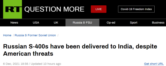 “盡管美國威脅,俄羅斯S-400防空導彈系統已交付給印度。”“今日俄羅斯”(RT)6日以此為題報道稱,隨著俄羅斯總統普京當天對印度進行“具有里程碑意義”的訪問,印方證實,俄羅斯S-400防空導彈系統的交付工作正按計劃進行,這筆交易曾引起美國的強烈反對。