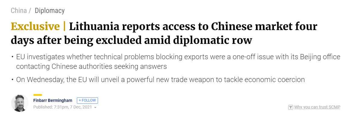 《南華早報》報道截圖 據《南華早報》12月8日報道,立陶宛企業家聯合會(Lithuania Confederation of Industrialists)主席維德曼塔斯·吉納勒維丘斯(Vidmantas Janulevicius)透露,該聯合會成員在出口商品到中國時,可以(在海關系統)中選擇將原產國選為“立陶宛”。