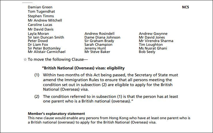 達米安·格林提出的修正案 報道稱,上月初英國議會審議《國籍與邊界法案》時,英國保守黨議員、前副首相達米安·格林(Damian Green)提出一項修正案,呼籲放寬BNO簽證申請資格,讓父母其中一方持有BNO護照的香港人,也可以申請BNO簽證。 修正案獲得獲得英國前衛生部長傑里米·亨特(Jeremy Hunt)、下議院外交事務委員會主席湯姆‧圖根哈特(Tom Tugendhat)等20多名議員的支持。 當地時間12月7日,該修正案在下議院展開辯論,格林聲稱,他的修正案旨在為香港“反抗壓迫的勇敢青年提供更多保護”。 不過,英國負責移民和邊境事務的政務次官凱文·福斯特(Kevin Foster)表示,該修正案沒有設置年齡限制,也可擴展到從未踏足香港的持BNO護照人士子女,這會存在一些問題。 福斯特指出,不符合資格申請BNO簽證的人士仍有方法前往英國,例如以學生身份或工作假期(即“青年流動計劃”)等,而英國每年有1000個工作假期名額,比申請人數更多。 格林表示,他不會在下議院推動對有關修正案進行投票,希望給予政府官員更多時間,為適合香港年輕人的“流動計劃”制定更好的細節。他又稱,希望上議院版本的修正案能夠獲得通過。