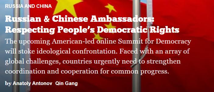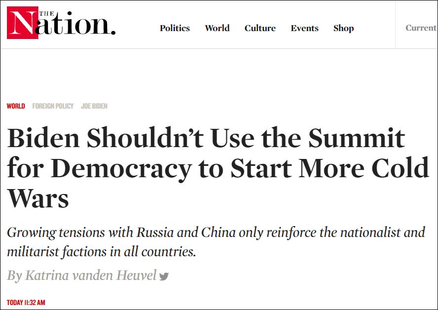 《國家》雜誌評論文章截圖 文章指出,在特朗普的錯誤執政之後,美國總統拜登因其“撥亂反正”式的領導而贏得廣泛贊譽,當他今年夏天在康沃爾參加七國集團(G7)領導人峰會、在布魯塞爾參加北約峰會以及在日內瓦會見俄羅斯總統普京時,不斷強調“美國回來了”這一口號。 但是,“美國回來了”是為了什麽?拜登的這一口號背後的核心是支持北約盟國同俄羅斯展開新的全球對峙,同時也在越來越多的方面同中國對峙。文章認為,目前除了災難性的氣候變化和持續的新冠疫情對人類構成了生存威脅之外,更不祥的是,拜登似乎正在復興冷戰時期的政治。 《國家》雜誌注意到,隨著“民主峰會”的召開,舊時的冷戰似乎正在重現。今年6月北約峰會最後的公報中,該組織不僅宣稱俄羅斯的“侵略性行動”對歐洲-大西洋的安全構成了威脅,還首次提出中國日益增長的影響力和國際政策也是它們的“系統性挑戰”。 對於這場“民主峰會”,中國駐美大使秦剛及俄羅斯駐美大使安東諾夫罕見地在美國《國家利益》(National Interest)雜誌發表了聯合署名文章,他們表示,該“峰會”是冷戰思維的明顯產物,將挑起意識形態對抗和世界分裂,制造新的“分隔線”,與當今世界的發展相矛盾。中國和俄羅斯堅決反對這一舉動。