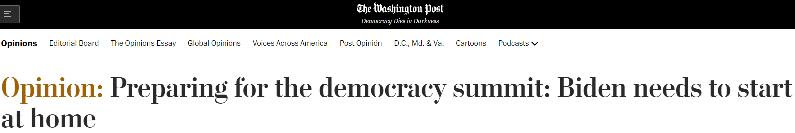 《國家利益》雜誌文章截圖 文章稱,在黨派分歧日益嚴重的美國,應對中國和俄羅斯構成的“威脅”促成了兩黨達成共識。阿肯色州的右翼共和黨籍參議員湯姆·科頓(Tom Cotton)今年2月曾在一篇題為《擊敗中國》(Beat China)的報告中狂言,中國是“新的蘇聯”:“美國再次面對著一個試圖主宰歐亞大陸、重塑世界秩序的強大對手。” 因此,諸如科頓之流的美國政客在國內是“逢中必反”,文章指出,盡管拉入中俄形成“冷戰對峙”非常危險,但不幸的是,這卻是美國當權者的最佳選擇——強大的軍工團體將獲得新的重要利益、五角大樓獲得龐大預算和新的武器部署仍毋庸置疑、北約能夠得到全新的“使命”……而在各種政策、協議、開支上爭吵不休的美國兩黨,也能找到所謂的“共識”。 《國家》雜誌最後用告誡的口吻寫道,重返冷戰的代價是巨大的,同時還會嚴重扭曲美國目前所面臨的真正安全威脅,比如氣候問題,極端天氣對美國人的生命、財產和資源造成了越來越多地傷害,如果沒有中國的合作,這一問題無法得到解決。此外,特朗普政府在新冠疫情方面制造的一系列涉華謊言,也加深了針對亞裔美國人的仇恨犯罪,導致美國內部裂痕明顯。 佛蒙特州民主黨籍參議員伯尼·桑德斯(Bernie Sanders)曾發出警告:“主要衝突不是發生在國家之間,而是發生在國家內部。如果民主要獲勝,它不會是在以往那些傳統領域,而是通過證明民主實際上可以為人們提供比其他主義更好的生活質量上。” 而在近幾日,《華盛頓郵報》也刊發了一系列報道文章和評論文章,聚焦拜登政府的主辦的“民主峰會”。 其中,一篇文章指出,翻看“民主峰會”的參會名單,美國簡直就是在“自我打臉”,按照美方的標準,一些完全不符合其標準定義的國家和政府都受邀參加這場會議,裏面無疑充滿了地緣政治上的算計。該報另一篇評論文章則直言,若要為“民主峰會”做準備,拜登更應該從自己家裏開始。