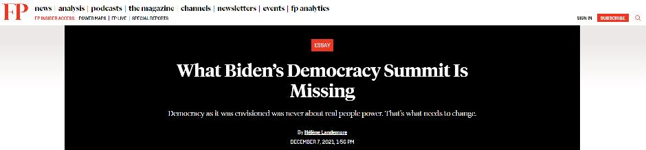 《華盛頓郵報》報道截圖 文章指出,美國非政府組織“自由之家”(Freedom House)為此次“民主峰會”的與會者列出了一項排名,在“全球自由度”得分上,美國得分為83分(滿分100分),比芬蘭、丹麥、愛沙尼亞、烏拉圭、日本和新西蘭等國都差。報告稱:“近年來,其(美國)民主制度受到侵蝕,這反映在選舉中的黨派施壓、刑事司法系統的偏見和功能障礙、對移民和尋求庇護者的有害政策以及日益加劇的財富經濟差距。” 文章還稱,令人感到諷刺和和悲哀的是,共和黨此前就以美國所謂其他國家存在的“不自由方式”行事,試圖破壞選舉制度、限制投票機會、詆毀選舉神聖性以及對暴力視而不見。事實上,美國作為一個“領先民主國家”的信譽已經岌岌可危。 《華盛頓郵報》還寫道,盡管拜登政府正在努力挽回形象,但是就其為峰會所做的準備來看,他們並沒有一個明確的目的。 當地時間12月7日,美國《外交政策》(Foreign Policy)雜誌也發表了評論文章,題為《拜登的“民主峰會”缺少什麽》。文章作者“吃力不討好”地花了很長篇幅,認真討論了自己對於民主最基礎的看法,全然沒有意識到拜登政府這場“民主峰會”和民主毫無關係,滿是政治操弄。