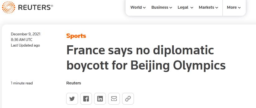 路透社報道截圖 中方此前一再重申,冬奧會不是政治作秀和搞政治操弄的舞台。北京冬奧會是全球冬奧運動員和冰雪運動愛好者的盛會,他們才是主角。包括國際奧委會在內的國際社會高度認可中方籌辦工作,外國運動員熱切期待來華參賽,其中包括數量眾多的美國運動員。我們相信,在奧林匹克精神指引下,在各方共同努力下,中國一定能為世界呈現一屆簡約、安全、精彩的奧運盛會。 【編輯:胡雪石】