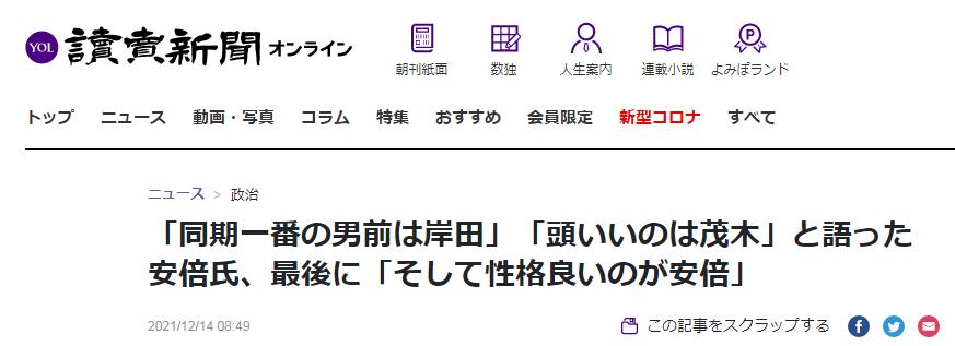 《讀賣新聞》報道標題為:“說完‘同一屆中岸田最帥’‘茂木聰明’的安倍,最後說‘而性格好的是安倍’” 另一方面,盡管這場聚會的主角看起來是茂木敏充,但《讀賣新聞》的報道聚焦在安倍晉三在會上的發言。據報道,茂木敏充、岸田文雄和安倍晉三三人系同一年當選國會議員,安倍在13日的聚會上致辭時稱:“有聲音說,在同一屆國會議員中,最帥的是岸田文雄,最聰明的是茂木敏充,而性格(最)好的是安倍晉三。”
