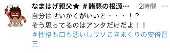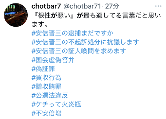 此外,有網民看到安倍發言後批評稱:“‘(生來)天性差’是最適合(安倍)的詞。”並附上了涉及安倍晉三的“森友學園問題”“賞櫻會”等醜聞被曝光時日本網民在推特上進行“網絡示威遊行”時使用的標簽。