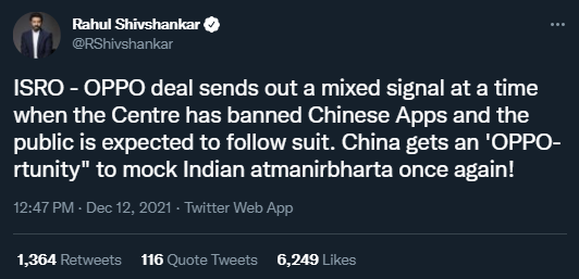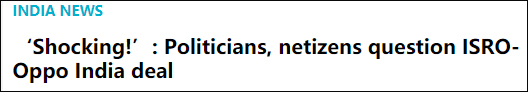 印度航天機構宣佈與中企合作,印度國內又吵了起來12月9日,印度國家航天機構——印度空間研究組織(ISRO)發布聲明,宣佈與中國手機品牌OPPO印度公司開展合作。12月10日,OPPO印度公司在推特上證實了這一消息。 此事一經傳出,印度國內便吵了起來。據《印度斯坦時報》、《印度時報》等媒體報道,部分印度政客藉此炒作中國威脅,印度國會發言人稱,在中印存在邊境爭端的情況下,ISRO與中國公司合作“令人震驚”。還有印度議員炒作稱,此項合作會給印度國防安全帶來威脅。