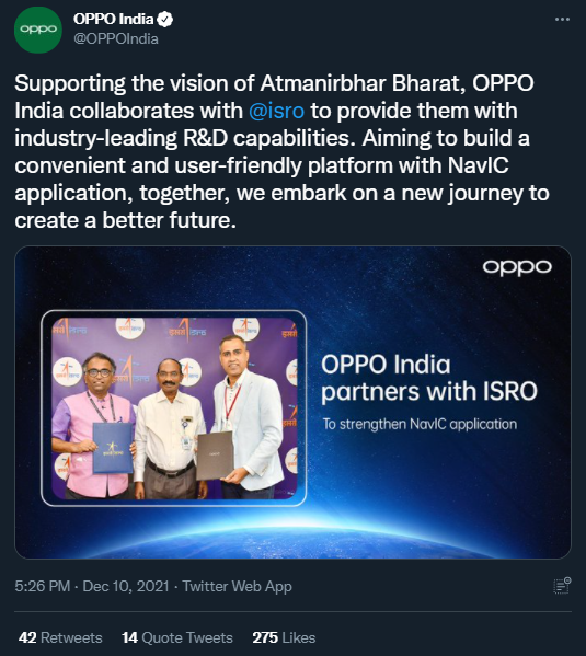 題為“‘令人震驚!’:政客、網民質疑ISRO和OPPO印度的合作”,《印度斯坦時報》截圖 根據印度空間研究組織(ISRO)官方聲明,ISRO與OPPO印度公司的合作主要是推動印度國產導航系統NavIC在移動平台上提供短消息服務。這種服務可以在通訊不暢或者無通訊地區(如海上)廣播生命安全警報。目前兩方已經簽署諒解備忘錄。 聲明稱,ISRO主席凱拉薩瓦迪沃·希萬(Kailasavadivoo Sivan)敦促OPPO印度公司將NavIC系統納入到其未來所有移動平台的定位服務解決方案當中。 NavIC系統全稱“印度區域導航衛星系統”,由ISRO開發,總投入約29.8億美元(約合人民幣189.69億元),自2013年7月至2018年4月,總共發射9次,共送8顆衛星上天,有1顆失效,目前7顆在軌工作,還有1顆發射失敗。印度計劃在未來把工作衛星數目增加至11顆。 12月10日,OPPO印度公司也在官方推特上發布了與ISRO的消息,並表示將立誌打造一個方便快捷、對用戶友好的包含NavIC系統應用的平台。“我們正開啟一場新的旅程,去創造更好的未來。”