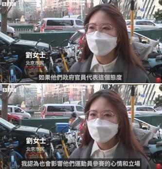 隨後BBC在製作的視頻內介紹事件所處的新聞背景,宣稱繼美國基於所謂人權記錄率先宣佈不參加冬奧會後,澳大利亞,英國等國也表態不派高級官員參加冬奧會,並闡述中方立場:中國外交部表態批評澳、加等國利用奧運平台政治操弄,“必將為錯誤行徑付出代價”。 “冬奧會舉辦地北京的市民,對此又有什麽看法呢?”隨後,BBC接連播放了幾位受訪者的采訪片段。