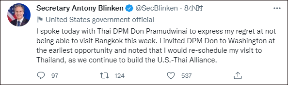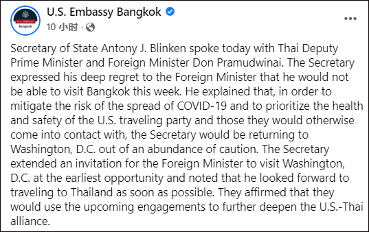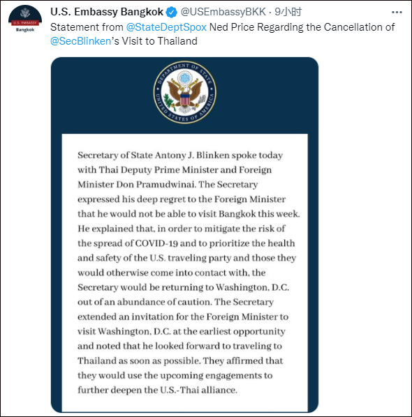 美駐泰使館:布林肯取消泰國之行 聲明寫道,布林肯對不能在本周末訪問泰國深表遺憾。為了降低新冠病毒傳播風險,優先考慮美國訪問團和他們可能接觸到的人的健康和安全,布林肯在謹慎考慮後決定返回華盛頓特區。 同一時間,美國國務院發言人普萊斯表示,美方已經邀請泰國總理訪問美國,並將重新安排時間、盡快訪泰,以進一步深化“美泰聯盟”。 稍晚時候,布林肯本人在推特發文稱,他已經向泰國副總理兼外交部長敦·巴穆威奈表達了遺憾之情。