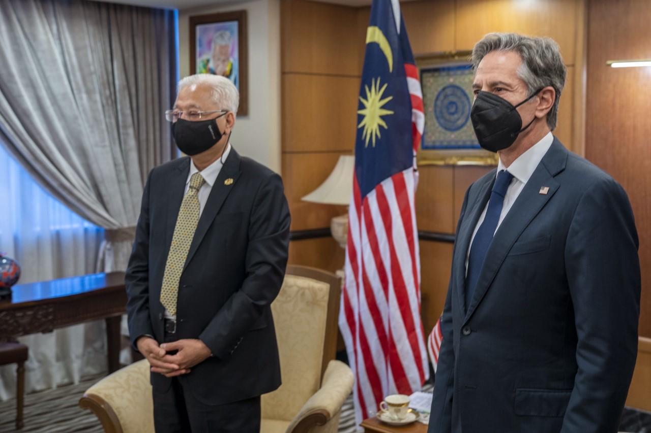 馬來西亞總理(左)與布林肯15日舉行會談,圖自社交媒體 在隨行人員確診的消息確定前,15日早些時候,布林肯與馬來西亞總理伊斯邁爾、外長賽夫丁、能源部長等高級官員和美國駐馬來西亞大使會談,並出席了美國政府推動成立的地區交流組織“東南亞青年領袖倡議”(YSEALI)在吉隆坡舉行的活動。 按照原計劃,布林肯會在15日結束在馬來西亞的行程後,前往並抵達泰國。 【編輯:俞丹鳳】