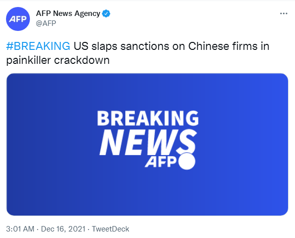 美國財政部網站當地時間15日發布消息稱,美國總統拜登當天簽署了一項新的行政命令,對中國、巴西、哥倫比亞、墨西哥4國的15家實體和10名個人實施制裁,其中包括中國4家企業和1名個人。根據美國財政部網站,美方的所謂制裁理由是打擊芬太尼等藥物濫用成癮問題,並指控是這些企業和個人“參與了全球非法藥物貿易”。法新社稱,美國國務卿布林肯在一份聲明中宣稱,這一制裁行動“將有助於阻斷使合成阿片類藥物及其前體化學品能夠進入美國的全球供應鏈和金融網絡”。
