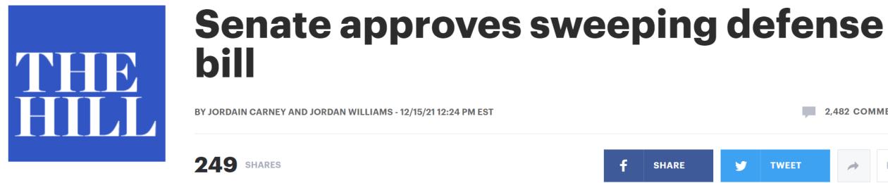 那份夾帶涉台私貨,渲染中俄“威脅”的美國2022財年國防授權法案,在參議院獲得通過。據美國《國會山報》報道,美國參議院當地時間12月15日以88票贊成、11票反對的投票結果,通過了價值約7700億美元的2022財年國防授權法案。該法案上周在眾議院獲得通過。《國會山報》稱,法案隨後將由美國總統拜登簽字使其正式成為法律。