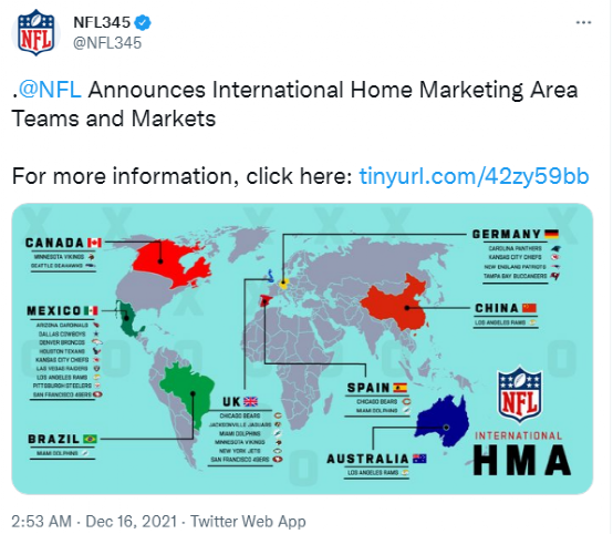 報道聲稱,NFL日前宣佈,其18支球隊“已獲準進入8個國家的26個‘國際家庭營銷領域’(IHMA)”,作為讓這些球隊“進入其他國家和地區進行營銷、球迷參與和商業化”計劃的一部分。NFL首席戰略官克里斯托弗·哈爾平在一份新聞稿中表示,“這個重要的倡議使得NFL球隊能夠與國外的NFL球迷發展有意義的、直接的聯系,助推NFL在全球的球迷增長和熱情”。 不過,這家美媒的關註點顯然不在NFL的國際合作和推廣上。 該家媒體話鋒一轉,接著寫道:NFL還發布了一張顯示將與該聯盟合作的國家的地圖,地圖中台灣被作為中國的一部分,統一標記為紅色。
