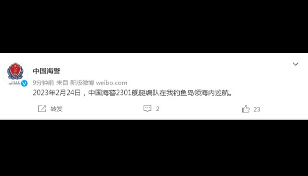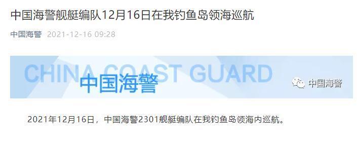 “中國海警”微信公眾號16日發布消息稱,2021年12月16日,中國海警2301艦艇編隊在我釣魚島領海內巡航。日媒隨後迅速關註。日本共同社剛剛報道稱,日本第11管區海上保安總部(那霸)聲稱,16日上午10時前後,4艘中國海警船只相繼駛入釣魚島(日本稱尖閣諸島)附近的“日本領海”,上午11時35分前後駛離相關海域,進入外側的毗連區。