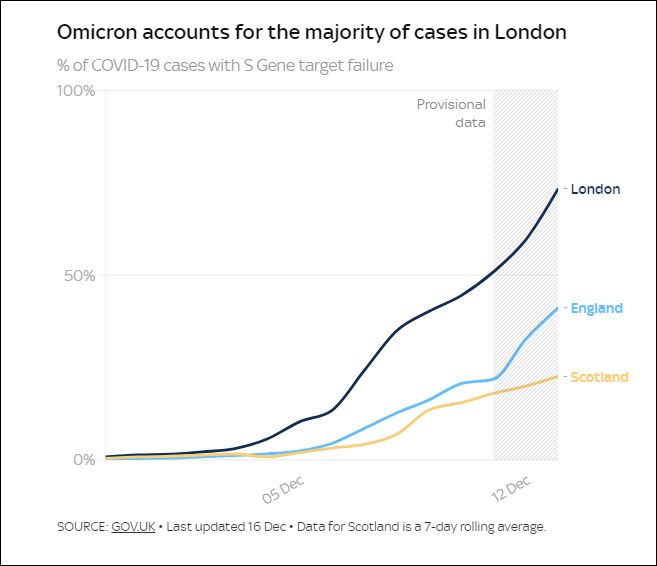 倫敦、英格蘭、蘇格蘭等地確診病例中S基因靶標失效占比 UKHSA數據顯示,奧密克戎毒株正在英國快速傳播,確診病例在不到兩天內就翻了一番。最新數據顯示,目前英格蘭新增病例的41%、蘇格蘭新增的超五分之一都顯示出S基因靶標失效(SGTF),倫敦地區更是達到四分之三。S基因靶標失效通常作為是否感染奧密克戎變異毒株的指標。 賈維德上周也曾警告,到本月底,英國的奧密克戎確診病例或達到100萬。