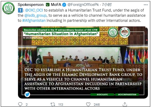 阿富汗經濟告急,伊斯蘭合作組織呼籲美國解凍阿資產伊斯蘭合作組織19日在巴基斯坦首都伊斯蘭堡召開外長理事會特別會議,商討國際社會如何協力拯救阿富汗經濟免於崩潰。 會議決定設立一個人道主義信托基金,由伊斯蘭開發銀行與其他國際機構合作籌措對阿富汗援助款。與會代表還呼籲美國解除對阿富汗中央銀行海外資產的凍結,使阿富汗銀行系統盡快恢復正常運轉。