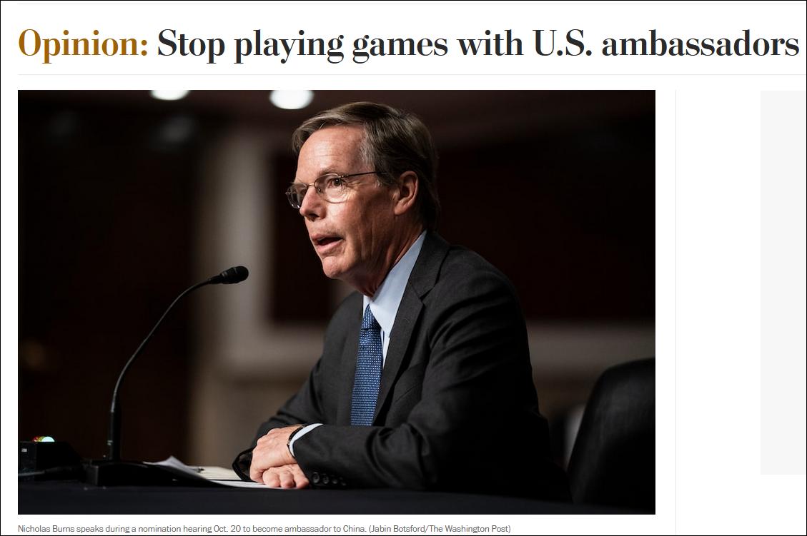 《華盛頓郵報》17日發表艾利森的評論文章,配圖為美國新任駐華大使伯恩斯 艾利森是哈佛大學肯尼迪政府學院教授,曾任克林頓政府國防計劃助理部長。他提出了著名的“修昔底德陷阱”一詞(意為“新崛起的大國必然挑戰守成大國,也必然會遭到對方回應,這樣戰爭變得不可避免”)。他在文章開頭便提到,盡管美國政府將中國列為最嚴峻的挑戰,但卻花了11個月的時間來決定新任駐華大使的任命。這種系統性問題依然存在——今天,美國近200個大使職位仍有93個空缺。中國的情況又如何呢?答案是0。 艾利森認為,拜登政府之所以在大使任命上步伐緩慢,與其國內兩黨鬥爭不無關係。比如共和黨參議員克魯茲(Ted Cruz)和盧比奧(Marco Rubio)一直在濫用參議院“建議和同意”的憲法權力(指總統對職位的提名必須得到參議院批準,否則不生效),有意拖延數十項大使的提名,包括駐華大使等最重要的職位。一些被提名人甚至在參議院外交關係委員會作證並獲得贊成票後,還要等上數月之久。為克服這一“阻礙”,限期結束討論的申請被提出,參議院最終被迫通過對伯恩斯的提名。