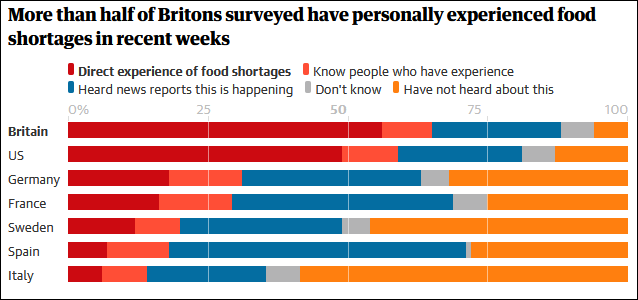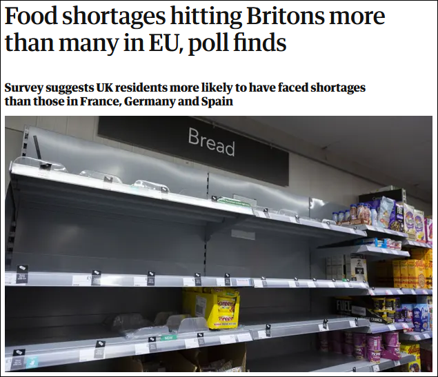 英國《衛報》報道截圖 英國《衛報》12月22日就報道稱,一項民調顯示,英國人現在所經歷的食品和燃料短缺狀況可能比6個歐盟成員國要嚴重許多倍。 調查顯示,英國居民經歷多次食品和燃料短缺的情況,可能比法國、德國、西班牙、意大利、瑞典和丹麥這6個歐洲國家要多得多,甚至更甚於美國。 12月初,當這項調查問及最近幾周是否親身經歷過食物短缺時,56%的英國受訪者表示有,有9%的英國人表示自己沒有親身經歷過,但是知道有人經歷過。 而在美國,相應調查數據分別為49%和10%。在歐洲大陸地區,前一項調查的比例要低3至9倍:德國為18%,法國為16%,瑞典為12%,丹麥為8%,西班牙為7%,意大利為6%;後一項調查比例則從法國的13%到丹麥和意大利的8%不等。特別是丹麥和意大利,這兩個國家有58%的受訪者稱自己甚至沒意識到供應鏈問題導致了食品短缺。