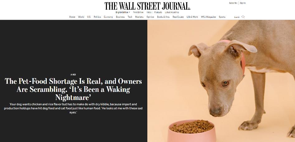 《華爾街日報》報道截圖 有一位名叫菲利斯·波梅塔(Phyllis Pometta)寵物主人,逛了五家商店才找到一種通常不會買的狗糧,然而她的狗卻並不願意吃,勉強吃下後,狗的胃不舒服了好幾天。 最終,波梅塔只能選擇自己買食材給狗做飯,狗也非常願意吃,但她卻指著家人說道:“養活五個人已經夠難的了,我不想做狗糧。” 報道稱,正當消費者在商店和網店尋找其他商品時,像波梅塔這樣的寵物主人卻在苦苦尋找合適的狗糧,因為供應鏈危機打亂了寵物食品的供應狀況。 有超市高管表示,勞動力、原材料和運輸力的短缺,正在影響人類從飲料到零食等各種食品的供應,寵物食品也面臨同樣挑戰,甚至更為嚴峻。由於疫情,越來越多的人在家收養寵物,但對於貓狗這類對特定品牌食物或口味有依賴性的寵物來說,如果被迫做出改變,可能會產生生理反應。 據報道,在美國,面對自己不喜歡吃的食物,許多貓狗聞也不聞,扭頭便走,即便還有一些勉強吃下去一點東西的寵物,也已經開始日益消瘦…… 由於無法找到替代品,許多超市的寵物食品貨架已經空了。寵物食品生產商暗示,這種短缺可能還會持續下去。美國食品制造商“J.M. Smucker Co.”11月已經通知零售商,將在2023年1月之前限制部分寵物食品的發貨,因為含液體包裝食品通常會使用進口原料,在運輸方面會帶來挑戰。 今年聖誕節,美國啥都缺…… 在此之際,美國商家和消費者開始意識到,即將到來的聖誕節也“難逃一劫”。 《華盛頓郵報》上月26日就已發文稱,受供應鏈瓶頸和勞動力短缺影響,一些美國家庭恐無法買到聖誕樹;聖誕老人可能將缺席今年聖誕節,因為他(們)屬於新冠病毒高危人群。