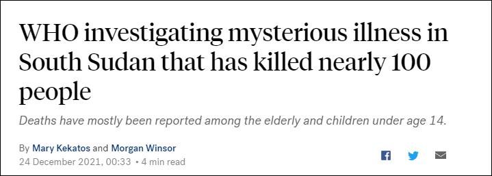 ABC新聞報道截圖 據美國廣播公司(ABC)12月24日報道,在南蘇丹北部瓊萊州的凡加克縣(Fangak),已有97人死於一種神秘的疾病。凡加克縣縣長比爾·布特羅斯(Biel Boutros)稱,最新一例死亡病例是一名老年婦女。 官員稱,這一神秘疾病的癥狀包括咳嗽、腹瀉、發燒、頭痛、胸痛、關節痛、食欲不振和身體虛弱。南蘇丹衛生部在一份聲明中稱,死亡病例大多為老年人和1至14歲的兒童。 11月,世衛組織已派團隊前往凡加克縣調研。比爾說,世衛組織團隊已離開,但沒有告訴當地官員他們的發現。 對此,世衛組織非洲區域發言人柯林斯·布瓦基·阿吉曼(Collins Boakye-Agyemang)回應稱,世衛組織11月開始調查這場疫情,但沒有提供進一步的細節。 據英國廣播公司(BBC)此前報道,暴發神秘疾病的地區正是洪水受災嚴重的地區。由於洪水泛濫,無法從陸路到達凡加克,世衛組織小組不得不乘坐直升機前往當地。世衛組織對患者的樣本進行了霍亂檢測,但這些樣本對導致霍亂的傳染性細菌檢測結果為陰性,排除了霍亂的可能性。霍亂是一種由細菌引起的疾病,通常經由受污染的水源傳播。2016年,南蘇丹曾暴發包括霍亂、瘧疾、麻疹、疑似出血熱和黑熱病在內的多重疫情,造成上百萬人感染。 這已經是南蘇丹連續第三年遭受嚴重洪災。據聯合國人道主義事務協調廳(OCHA)數據,自5月以來,超過83.5萬南蘇丹人受到洪水影響,預計這一數字在未來幾個月還會上升。應對饑餓行動組織稱,在凡加克等縣,受洪水影響的人數從75%躍升至10月底的近100%。同時,整個國家有800萬人需要幫助。估計有250萬人面臨嚴重的糧食不安全問題,超過10萬人接近饑荒。 自2020年以來,許多受災地區已無法再耕種,牲畜也因染病死去。《衛報》稱,一些陷入饑餓的家庭只能打漁,甚至尋找睡蓮當作食物,部分地區水源遭到洪水嚴重污染,缺乏飲用水。 無國界醫生組織11月發布報告稱,洪水是疾病爆發的“完美風暴”。該組織在11月發布的聲明中寫道:“人們沒有足夠的水,也沒有東西來儲存水,沒有垃圾收集,死山羊和狗被丟在排水系統中腐爛。隨著新難民湧入(難民營),情況進一步惡化,人們更有可能爆發急性水樣腹瀉、霍亂和瘧疾等水傳播疾病。” 南蘇丹是一個位於非洲東北部的內陸國家,經常遭受暴雨、季節性洪水和蝗蟲侵襲,但是,科學家指出,嚴重的洪災不僅是由降雨造成的,例如2021年1月發生在雨季之外的異常洪災。雖然每年5月至10月的雨季都會發生洪水,但科學家稱,最近凡加克縣的洪水在強度、地理範圍和持續時間方面都很特別,洪水的強度和頻率都在增加,擾亂了正常的遷移和應對模式。 根據全球氣候指數,南蘇丹是世界上受氣候變化最嚴重的國家之一。聯合國稱,非洲大陸對全球變暖的影響最小,但遭受的影響最大。除了南蘇丹,非洲大部分地區都將面臨越來越多的氣候衝擊。 【編輯:胡雪石】