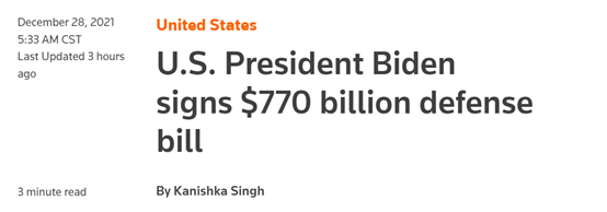 路透社最新消息,那份夾帶涉台私貨、渲染中俄“威脅”的美國2022財年國防授權法案,拜登剛剛簽署了。 路透社稱,白宮當地時間27日表示,總統拜登簽署了價值約7700億美元的2022財年國防授權法案,此前該法案已在美國國會參眾兩院通過。