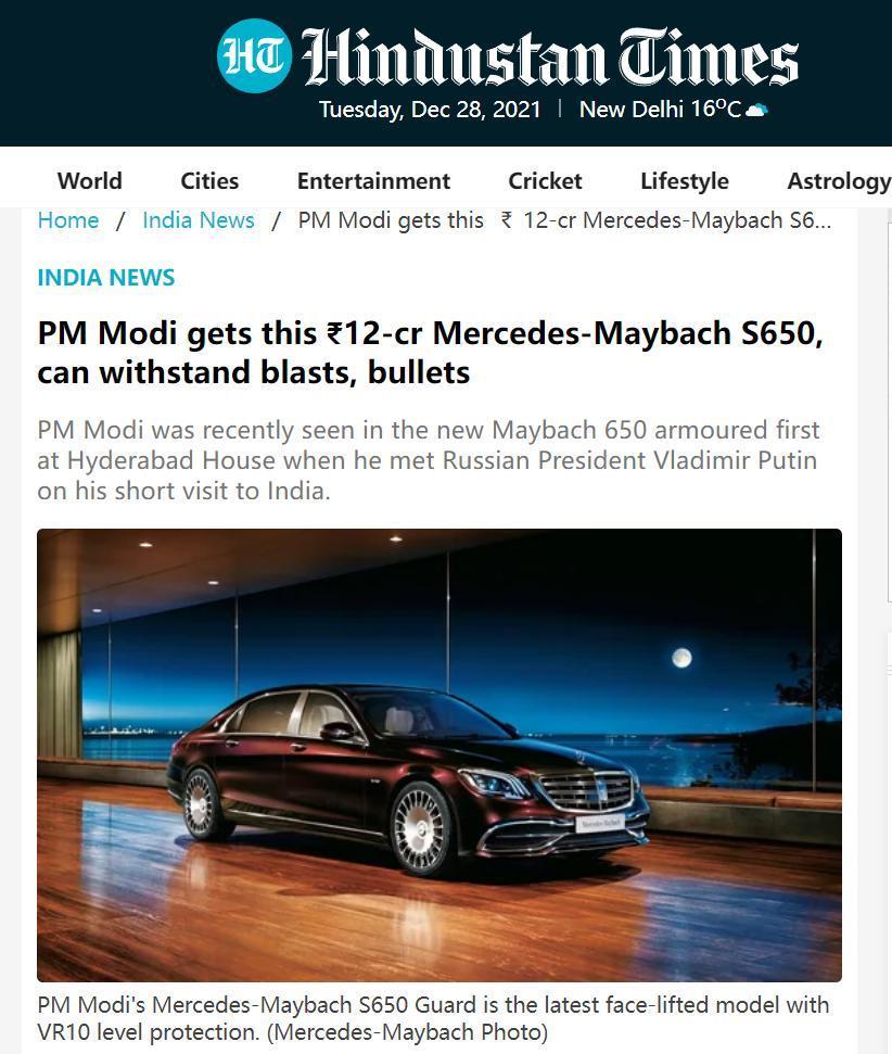 (《印度斯坦時報》:總理莫迪擁有了價值1.2億盧比的梅賽德斯-邁巴赫S650,可承受爆炸、子彈) 報道稱,莫迪乘坐的這輛新車於他和俄羅斯總統普京近期會晤期間首次出現在新德里海德拉巴宮外,是一輛梅賽德斯-邁巴赫S650。梅賽德斯-邁巴赫去年在印度推出了S600 Guard,價格為105000萬盧比(約89.3萬人民幣),而S650的價格可能超過1.2億盧比(約1020.5萬人民幣)。 《印度斯坦時報》介紹稱,該車通過了VR10最高防護等級和ERV 2010防爆評級,車身和車窗可抵禦爆炸和硬化鋼芯子彈,即使在距離僅2米的範圍內有15公斤TNT炸藥爆炸,乘客也可免受影響;窗戶內部塗有聚碳酸酯,車輛下部有厚厚的裝甲,以保護乘員免受直接爆炸的傷害。在氣體攻擊的情況下,汽車客艙也有相應處理裝置。 眼下印度國內麻煩不少,在《印度斯坦時報》推特評論區,一些網友對莫迪此時購置奢華豪車表達了不滿。↓