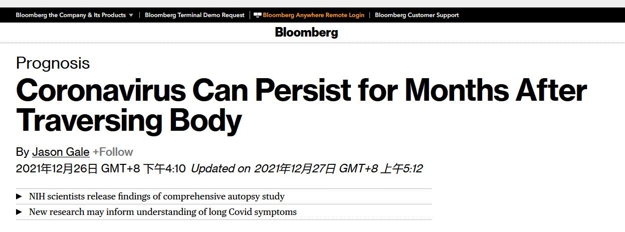 彭博社報道截圖 這些研究結果於25日發表在《自然》(Nature)雜誌的一份初稿中,該初稿正在審查中,預計將發表在《自然》雜誌正刊上。研究結果指出,病毒在體內遲遲得不到清除,是造成新冠病毒患者持續癥狀的原因。 國立衛生研究所(NIH)研究人員稱,他們對現有關於病毒在體內殘存的數據研究是最完整的。他們對44具新冠病毒死者的屍體進行瞭解剖,以確定新冠病毒在身體里存在的位置和數量。這些解剖共包括85處人體組織和體液的取樣,其中79處都檢測出了新冠病毒。 研究揭示,新冠病毒可以從呼吸系統蔓延到幾乎全部器官,在身體內部廣泛擴散,感染全身各處細胞,包括大腦、眼部組織、肌肉、皮膚、周圍神經、心血管、胃腸道、內分泌和淋巴系統。除此以外,新冠病毒還可以在體內長期存在,研究者通過分析一名患者RNA發現,在癥狀首次出現後,新冠病毒在其體內仍存在了230天。 密蘇里州退伍軍人事務聖路易斯衛生保健系統臨床流行病學中心主任齊亞德·阿爾-阿里( Ziyad Al-Aly)說::“這是非常重要的工作,很長一段時間以來,我們一直困惑於新冠病毒為何會影響了那麽多器官組織。這篇論文提供了一些線索,可能有助於解釋為什麽即使是患有輕度或無癥狀的患者,也會長時期在體內保留新冠病毒。” 阿爾-阿里教授表示,新冠病毒能夠侵入大腦的發現意義重大,因為這可以幫助科學家瞭解“長期新冠”患者的神經認知衰退和其他神經精神癥狀。 不過,這次研究也有一定的不足,目前科學家仍然沒有完全搞清新冠對病人的長期影響。比如,NIH的解剖研究的對象都是在新冠疫情爆發的首年去世的,那時還沒有疫苗面市。因此打了疫苗的人在感染新冠後,病毒在其體內的長期影響仍不得而知。 一些醫學專家對於這次研究給出了積極的意義,但也擔憂新冠病毒長期存在帶來的後續危險。 悉尼新南威爾士大學全球生物安全教授雷娜·麥金太爾(Raina MacIntyre)說:“我們不完全瞭解新冠病毒在體內長期存在的情況,但這些研究可以解釋持續的癥狀。我們還不知道未來幾年新冠慢性病會造成什麽樣的負擔。我們會在幸存者身上看到早發性心力衰竭或早發性癡呆嗎?” 麥金太爾表示,這些都是沒有答案的問題,需要采取預防性的公共衛生措施來減緩這種病毒的後續傳播。 【編輯:俞丹鳳】