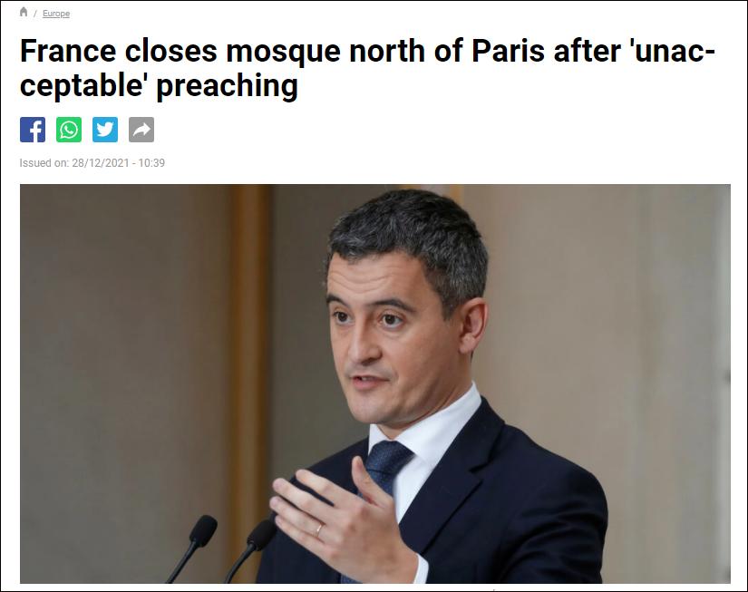 法國內政部長達爾曼寧,報道截圖 綜合法新社和英國廣播公司(BBC)28日報道,涉事清真寺位於法國北部、瓦茲省府首府博韋,距離巴黎以北約100公里。 早在12月14日,法國政府就盯上了這座清真寺。當時,法國內政部長達爾曼寧宣佈,伊瑪目“針對基督徒、同性戀者和猶太人”的佈道內容“不可被接受”,因此,他已經啟動了關閉該清真寺的程序。 當地時間12月27日,瓦茲省政府告訴法新社,在進行了為期10天的信息收集後,正式決定在兩日內關閉這座清真寺,時間為6個月。 管理該清真寺的非政府組織“希望與博愛”的律師證實了這一消息,稱他已決定就此向法院提出上訴。這名律師辯稱,發表不當言論的伊瑪目已被停職,且他所說的部分內容“被斷章取義”。 對此,法國內政部予以駁斥,並表示,這名涉事伊瑪目在發言中“將聖戰者稱作英雄”、為伊斯蘭教法中的嚴苛內容辯護、以及“將西方社會描述為仇視穆斯林的社會”。