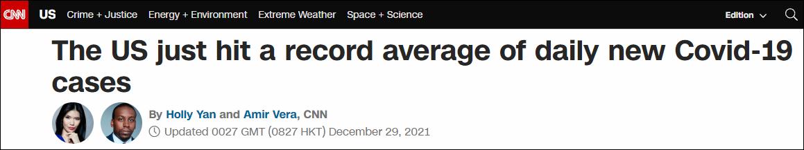 CNN報道截圖 美國單日新增,首破50萬例 根據美國約翰斯·霍普金斯大學的統計數據,截至北京時間2021年12月29日6時22分,美國新冠肺炎累計確診病例達到53105450例,累計死亡病例達到820458例。在過去約24小時里,美國新增確診病例511836例,新增死亡病例2732例。 很顯然,數據表明,美國疫情再次出現重大反彈,這是自新冠疫情大流行以來,美國單日新增確診病例數首次超過50萬例這一大關。