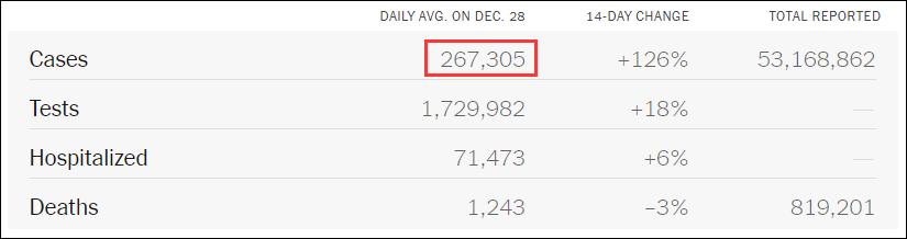 美國疫情曲線圖 數據自《紐約時報》 美國布朗大學公共衛生專家阿希什·賈阿(Ashish Jha)表示:“明年1月將是一個非常非常艱難的月份,人們應該做好(心理)準備,在一個月內會有很多人感染(新冠病毒)。” 美國有線電視新聞網(CNN)的醫學分析師喬納森·萊納(Jonathan Reiner)12月26日則已表示,他認為美國可能會在未來一周到10天之內,每天“輕而易舉地”出現新增病例超50萬例的情況。 除了日新增確診數創下新高之外,美國7天日均新增確診數也刷新歷史最高紀錄。 CNN稱,截至當地時間12月28日的一周內,美國平均日增新冠確診病例數達254496例,而《紐約時報》在這一數據上的統計更是達267305例,這超過了今年1月11日的單周平均日增病例數,當時的紀錄為251989例。