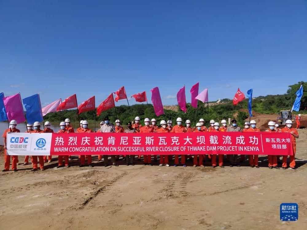 2021年12月31日,中國能建葛洲壩集團承建的肯尼亞斯瓦克大壩工程成功截流。這是大壩項目部員工在截流現場合影留念。 中國能建葛洲壩集團承建的肯尼亞斯瓦克多用途水利開發項目第一期——斯瓦克大壩工程於2021年12月31日成功截流,大壩主體工程正式進入全面施工的新階段。新華社發(唐亞洲 攝)