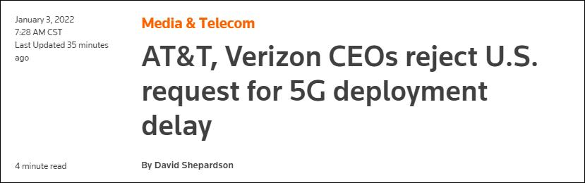 路透社報道截圖 電信商拒絕:物理定律在美國和法國是一樣的 美國兩大電信運營商——電話電報公司(AT&T)和威瑞森(Verizon),原本計劃1月5日正式部署他們在800億美元政府拍賣中贏得的C波段頻譜5G無線服務。 2021年12月31日,美國交通部長布蒂吉格(Pete Buttigieg)與美國聯邦航空管理局(FAA)局長迪克森(Steve Dickson)要求美國兩大電信運營商將5G部署向後推遲“不到兩周”,理由是擔憂5G使用的C波段可能危害航空安全。 據路透社報道,當地時間1月2日,美國電話電報公司(AT&T)和威瑞森通信公司(Verizon)的首席執行官發表了聯合聲明,拒絕拜登政府延遲推出5G無線服務的請求,認為這個要求將“損害我們數百萬消費者、企業和政府客戶”。 兩家公司還拿中國說事,稱美國在5G部署方面“落後於中國”和其他國家,造成這種情況的一個主要原因是“一些運營商無法獲得最適合的無線電頻率用於5G覆蓋。” 兩家電信運營商在聯合聲明中稱,他們願意讓步,在某些機場附近暫停部署六個月,這些機場將由美國官員和航空公司在談判中決定。 但是,兩家公司拒絕對5G使用的C波段進行任何更廣泛的限制。他們說,交通部門的建議將是“不負責任地放棄部署世界一流、具有全球競爭力的通信網絡所需的運營控制權”。 兩家公司表示,他們“承諾繼續”與運輸利益相關方合作,條件是美國聯邦航空局和航空業也承諾這樣做,並且“不會在其他地方加劇他們的不滿,盡管他們毫無根據。” 他們拿法國舉例稱,法國已經使用了5G服務,但美國的航班也能在法國正常飛行。 “物理定律在美國和法國是一樣的”,兩家公司的首席執行官寫道。“如果美國的航空公司被允許每天在法國運營航班,那麽同樣的運營條件也應該允許他們在美國這樣做。”