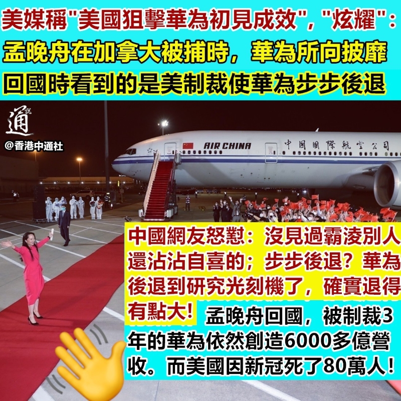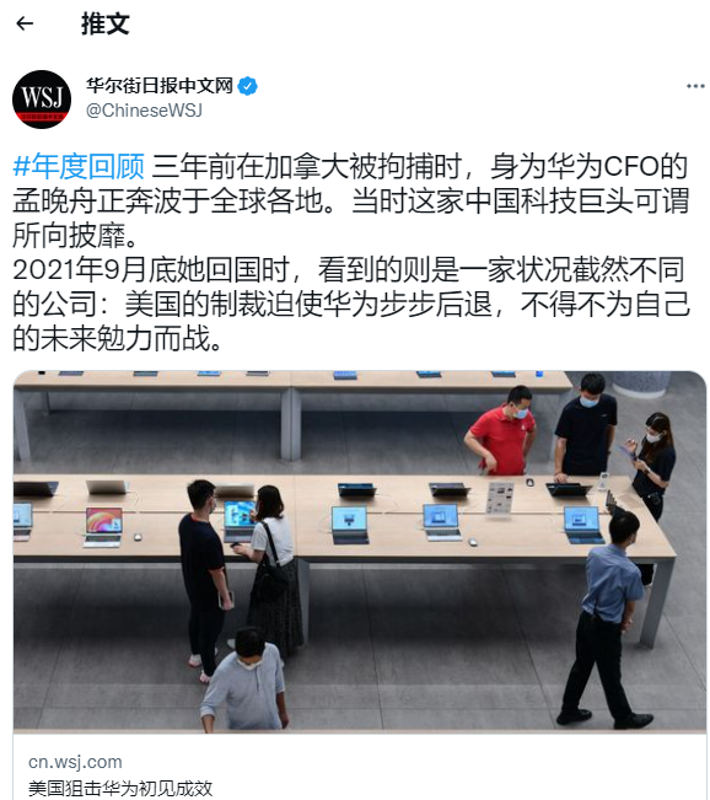 香港新聞網1月4日電 美國炮製孟晚舟事件,企圖遏制中國高技術產業,令美國標榜“世界民主自由燈塔”的形象轟然崩塌。眼見美國政府對中國企業下“黑手”,美媒在做“年度回顧”時“不以為恥反以為榮”,強行“炫耀”,結果遭中國網友怒懟! 3日,美媒華爾街日報中文網發表一篇名為《美國狙擊華為初見成效》的文章,并在社交媒體推特上“廣而告之”。文章聲稱,“三年前在加拿大被拘捕時,身為華為CFO的孟晚舟正奔波於全球各地。當時這家中國科技巨頭可謂所向披靡。2021年9月底她回國時,看到的則是一家狀況截然不同的公司:美國的制裁迫使華為步步後退,不得不為自己的未來勉力而戰。”