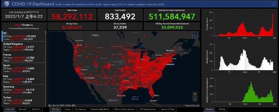 根據美國約翰斯·霍普金斯大學統計數據,截至北京時間2022年1月7日6時22分,美國新冠肺炎累計確診病例達到58292112例,累計死亡病例達到833492例。在過去約24小時裏,美國新增確診病例763150例,新增死亡病例1667例。