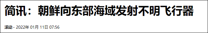 韓聯社報道截圖 韓軍方正對這一疑似彈道導彈的飛行器的射程、射高等參數進行分析。這是朝軍新年第二次武力示威。 僅在6天前,韓國聯合參謀本部5日發佈消息稱,朝鮮當天向朝鮮半島東部海域發射不明飛行器。韓聯社報道稱,這是朝鮮新年以來首次進行武力示威。 朝鮮勞動黨黨報《勞動新聞》1月6日確認了這一消息,稱朝鮮國防科學院5日再次試射高超音速武器。這是自去年9月29日朝鮮試射“火星-8”型高超音速導彈以後,朝鮮再次試射高超音速武器。