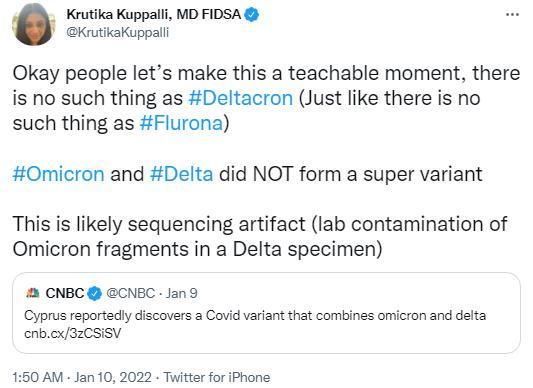 世衛組織新冠疫情團隊成員庫帕裏10日在社交媒體發文表示並不存在“德爾塔克戎”毒株。來源:庫帕裏社交媒體賬號截圖 據報道,世衛組織新冠疫情團隊成員庫帕裏10日在社交媒體發文表示,“並不存在德爾塔克戎毒株”,並稱這可能是在實驗室裏,德爾塔毒株的標本中混入了奧密克戎毒株片段。