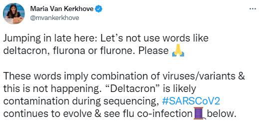 世衛組織衛生緊急項目技術負責人瑪利亞·範凱爾克霍弗呼籲不要再使用“德爾塔克戎”的叫法。來源:瑪利亞·範凱爾克霍弗社交媒體賬號截圖 晚些時候,世衛組織衛生緊急項目技術負責人瑪利亞·範凱爾克霍弗也針對這一問題在社交媒體發文,她同樣認為,之所以會出現“德爾塔克戎”,很可能是實驗室在測序過程中發生了污染,並呼籲不要再使用“德爾塔克戎”的叫法。 據此前的報道,塞浦路斯大學研究人員疑似在當地發現一種德爾塔與奧密克戎的重組新冠毒株,其基因與德爾塔毒株更為接近,但擁有大量奧密克戎毒株的特有變異。因此,該毒株被研究人員命名為“德爾塔克戎”。 【編輯:胡雪石】